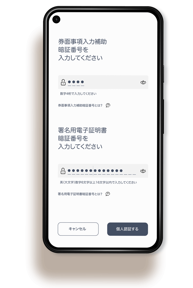 申請・予約等を対応フォームから入力し、認証時にスマホを直接起動 マイナンバーカードの暗証番号を入力するだけ